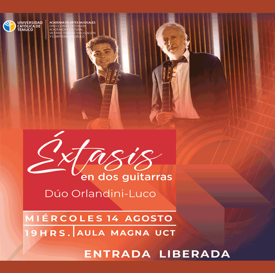 Concierto del Dúo Orlandini- Luco, a cargo de los maestros Luis Orlandini y Raimundo Luco en guitarra. El evento, a realizarse en el Aula Magna de la Universidad Católica de Temuco, inaugura parte de la cartelera cultural del segundo semestre de 2024. En dicho concierto, el dúo presentará un repertorio que abarca desde transcripciones de obras clásicas hasta música latinoamericana contemporánea.